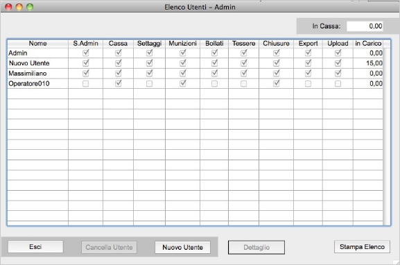 Le chiusure di cassa sono visibili da un SuperAdmin con il sotto-menu Chiusure di Cassa del menu Archivio. Quanto è il residuo di cassa e quanto hanno in carico gli utenti è visibile dalla loro lista in Gestione Utenti.